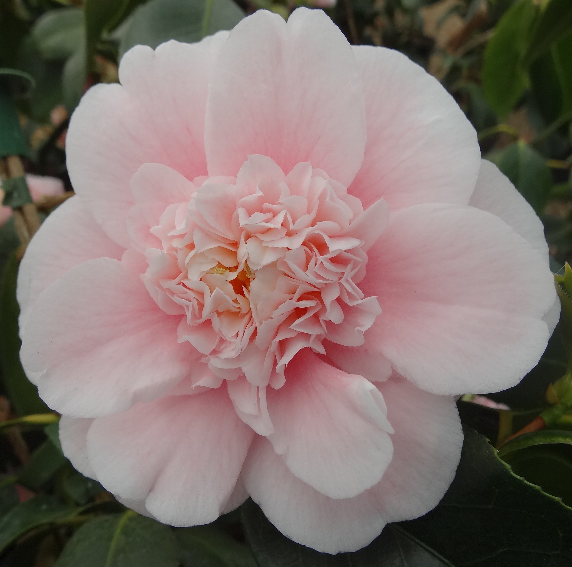 A beautiful camellia with a large compact growth, anemone form flowers, outer petals are silvery white to pink in the centre, with golden stamens. A very showy camellia giving much pleasure in late winter, early spring. Camellias can be kept in a pot for some years with growth of approx. 2-3m x 1.5m.
