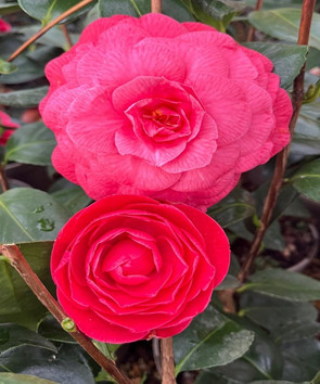 Hard to find in Britain, Camellia Francesco Ferruccio was cultivated in Italy in the early part of the1800s. It has the typical deep glossy evergreen foliage with new shoots coming in mid-spring. A hardy camellia with glorious double deep crimson red flowers, with smaller centred petals emerging in spring.