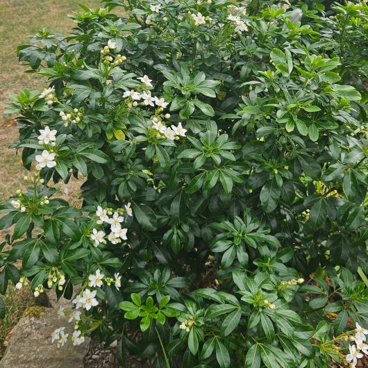 Choisya ternata, also known as Mexican Orange Blossom, is an elegant bushy evergreen shrub with aromatic leaves, divided into 3 slender bright green leaflets. Sweetly scented white flowers are borne in clusters throughout late spring and early summer, sometimes flowering again in autumn. Mexican orange is a useful plant for sun or semi-shade, they like fertile well-drained soil. Shrubs benefit from the occasional weed and mulch especially if they are being kept in a pot. (Don’t forget to water your plant in a pot)