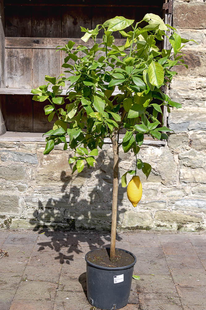 Lemon trees benefit from being outside in summer in a sunny protected area. This will strengthen the plant and help control any lurking pests which may be hanging around. Lemon plants do tend to flower at odd times of year in Britain but it is generally around Christmas time that the lemon citrus fruit appears. The bright evergreen leaves and fragrant white flowers are intoxicating and lovely to look at. Generally self-fertile, they bear lemons that hang from the trees looking like baubles at Christmas time. A very rewarding tree.