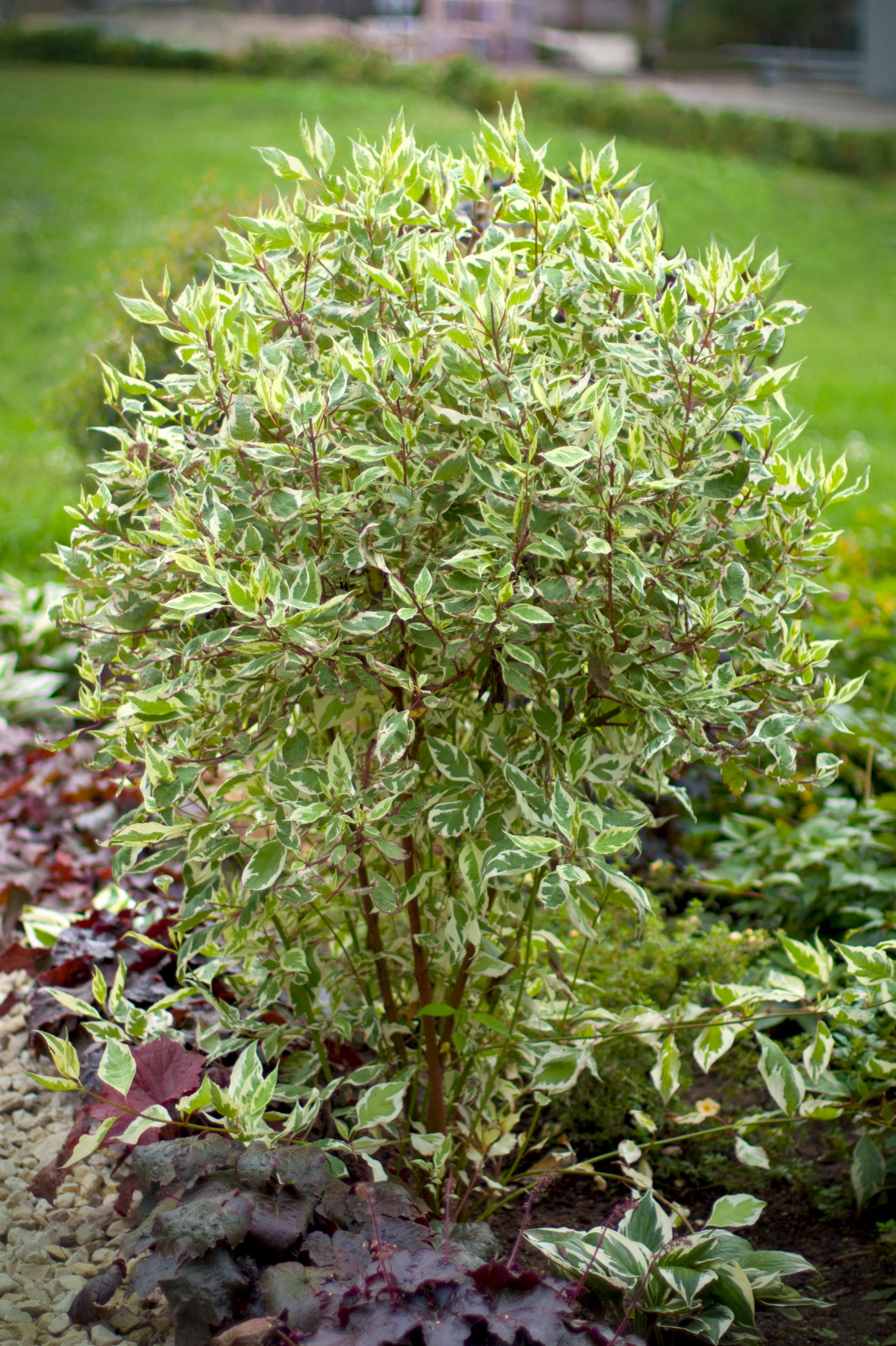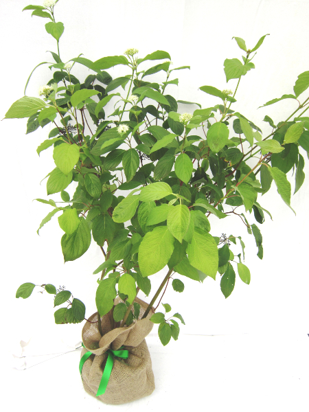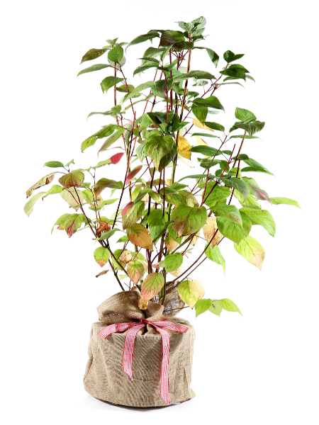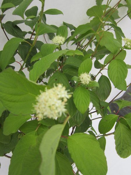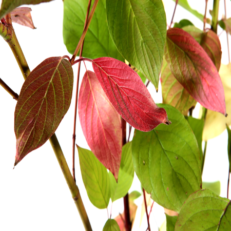 A deciduous upright then spreading shrub with wonderful scarlet, young shoots in winter. Dark green foliage fading to a soft green with creamy pink overtones, sometimes red and orange in Autumn. Heads of star shaped creamy white flowers in late spring and early summer followed by spherical white fruits.