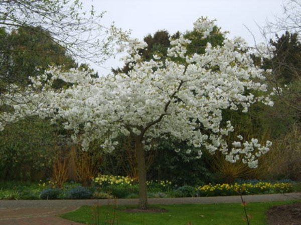 The dreamy flowering Cherry Great White Tai-Haku is a vigorous spreading tree with delicate buds borne in mid-spring into large semi-double pure white flowers which hang in clusters in summer. The young leaves are bronze-red maturing to dark green. It shows a spectacular display of orange and red foliage in autumn.