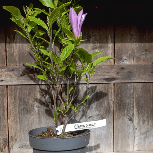 A dwarf magnolia with tulip shaped purple flowers. This tree has fragrant flowers in the Spring, which provide pollen and nectar for bees. It also attracts birds, and wildlife.