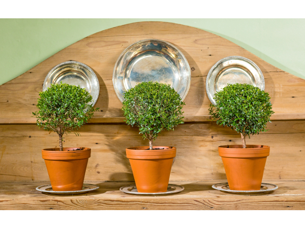 Our Myrtle or Myrtus communis is grown as a baby standard. Tiny aromatic evergreen leaves with sweetly scented delicate five-petalled white flowers with tufts of fluffy stamens appearing in late summer and autumn.