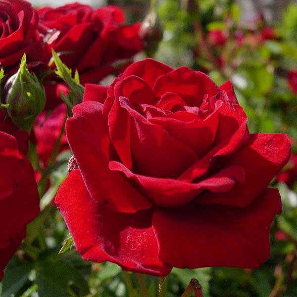 Bright crimson red roses with lots of short velvety petals which open out softly, blooming intermittently throughout the summer and are a vision to behold in any garden. The flowers come singly and in clusters of up to five and is a vigorous grower.