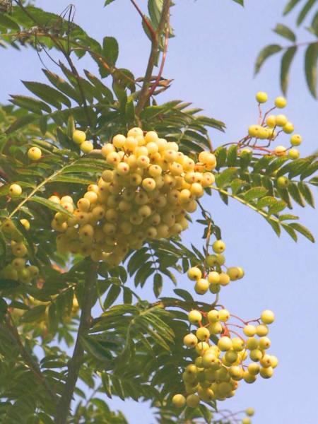 The Joseph Rock Sorbus Tree is an outstanding tree. Upright in growth with bright green leaflets turn the most beautiful shades of orange, copper, red and purple in autumn. Mountain Ash has white flowers in late spring followed by large clusters of small yellow berries in late summer and autumn.