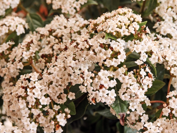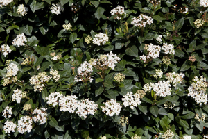 The Viburnum Tinus Shrub is an evergreen bushy shrub with clusters of white flowers in autumn through winter amid dark glossy green leaves, followed by small blue fruit.